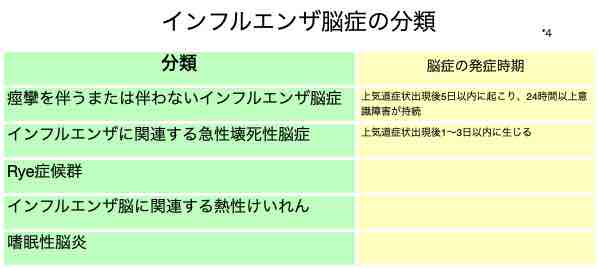 ・剖検脳や髄液中にインフルエンザウイルスを認めないことから、インフルエンザ脳炎ではなく「インフルエンザ脳症」と称される