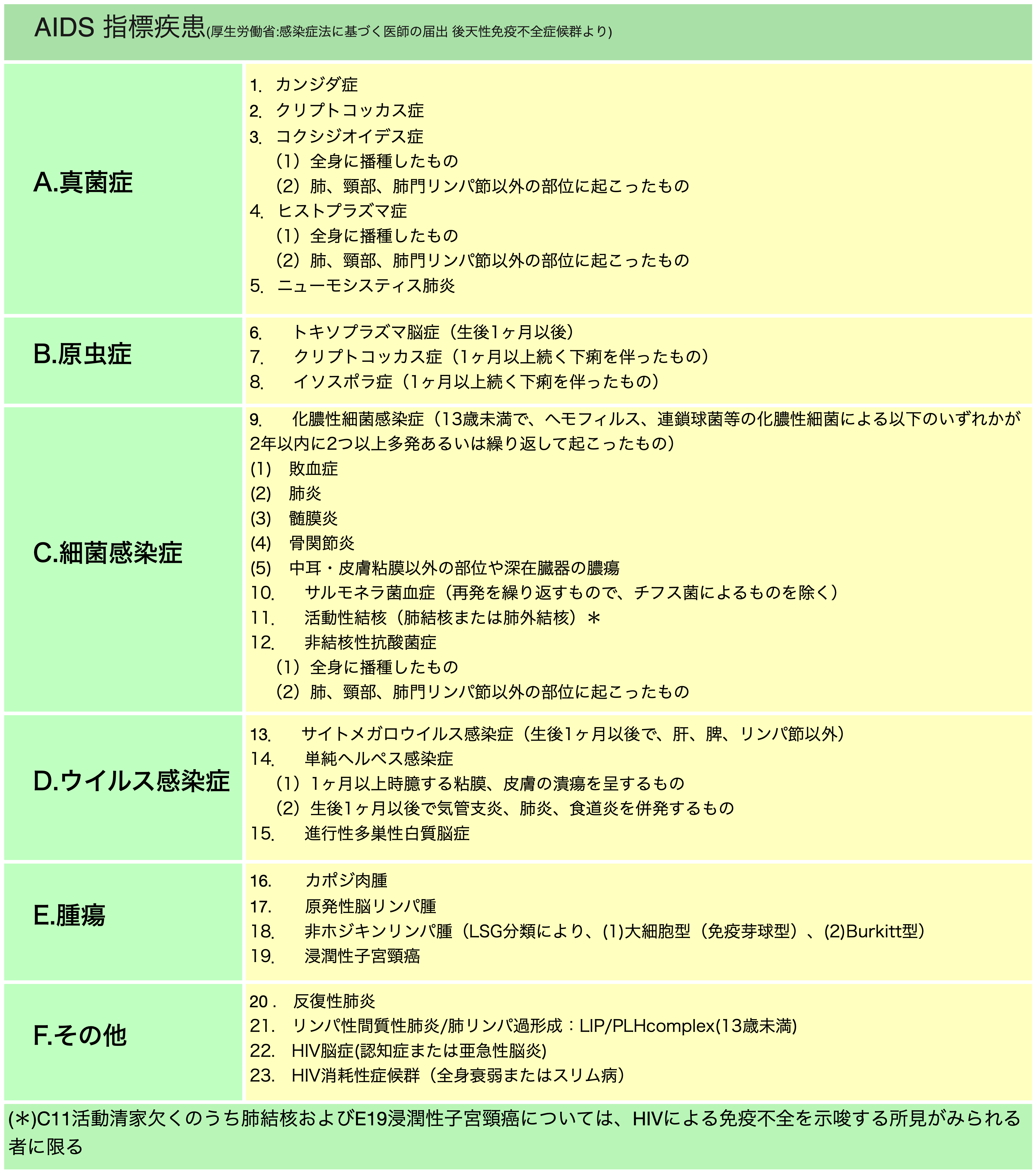 - 日本では最近、ウイルス、真菌などの感染症や、カポジ肉腫などの腫瘍等23指標疾患を発症した場合にAIDSと診断される