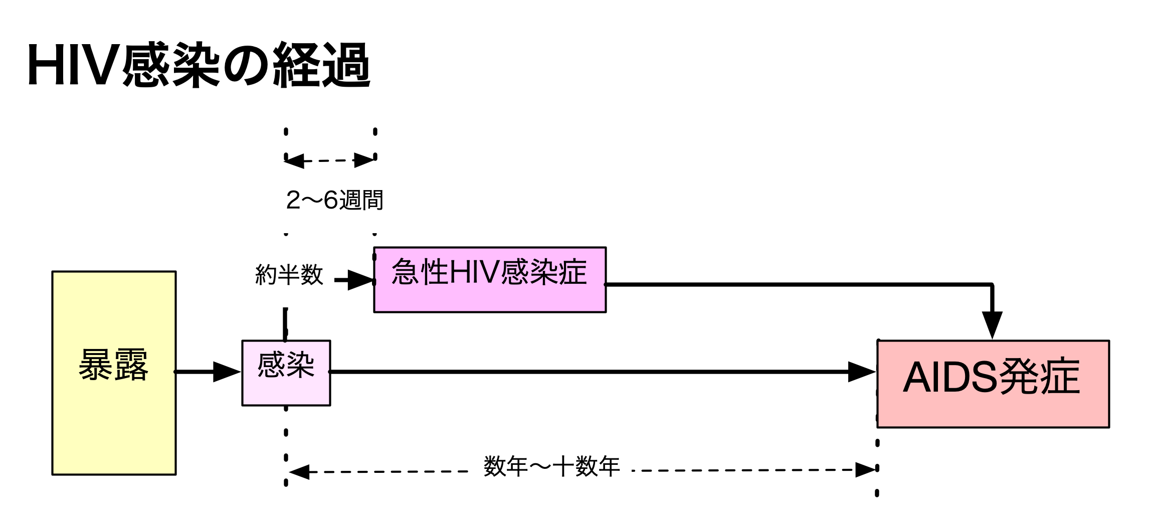 - 病気は、急性感染期、無症候期、AIDS期に分けられる
