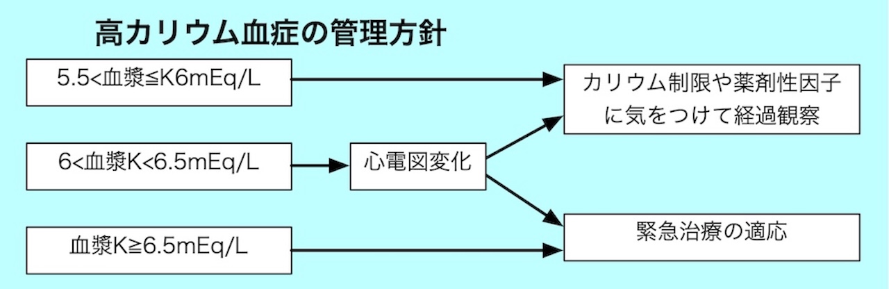 - 上記が原則だが、血漿K<7.0mEq/Lまでであれば外来で注意深く経過観察することも可能だと思う