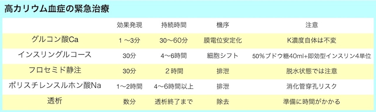 - 急性の病態、急性腎障害や横紋筋融解症などに伴って高K血症が生じた場合は緊急治療が必要