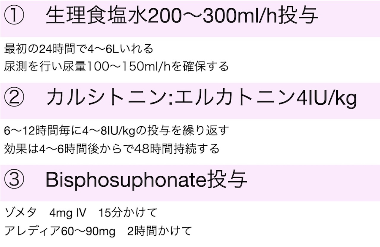 治療は原因に応じて異なるので血清Caが12〜14mg/dLであれば原因の特定を優先する