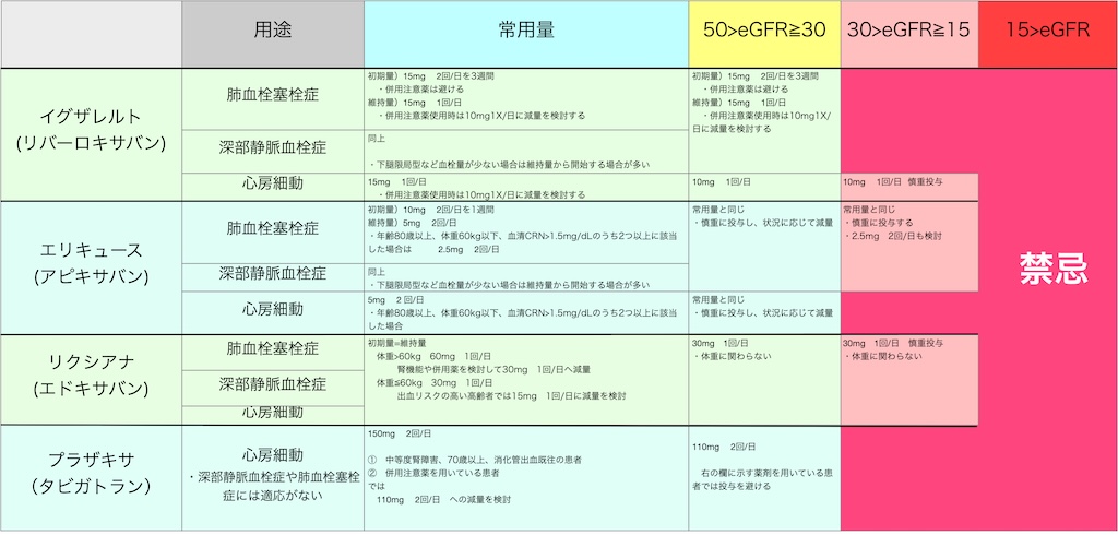 - eGFR<30で使えるのはエリキュースとリクシアナ
