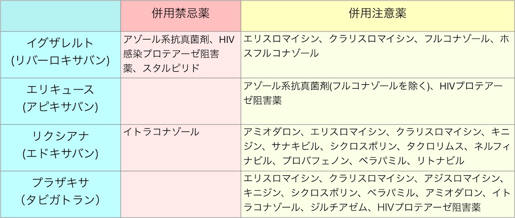 - それぞれ併用薬剤に注意が必要。エリキュースは併用薬に制限が少ない