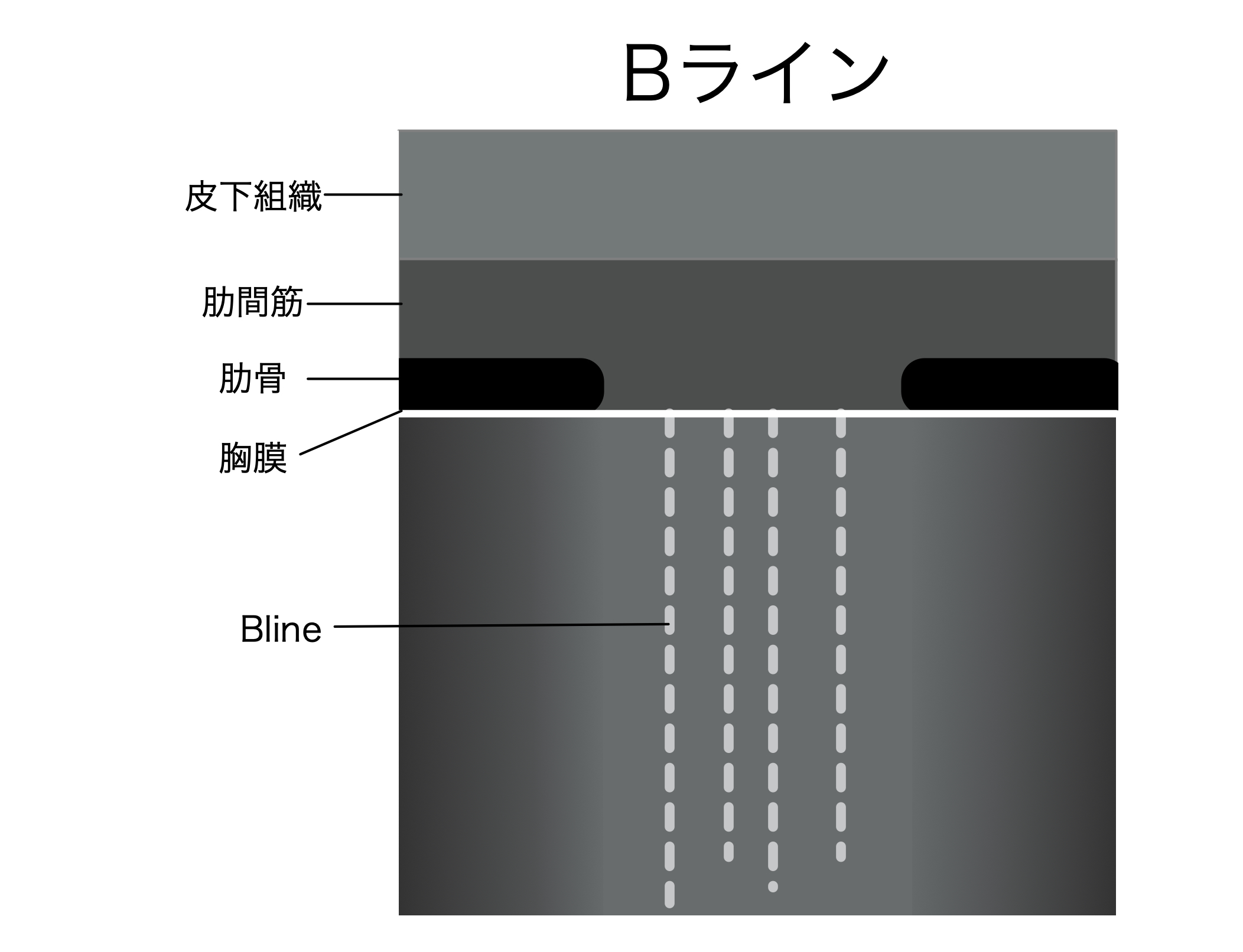 B-Lineは胸膜下から縦方向に深部まで届く線状のアーティファクト(下図はリニア型プローブの場合)。呼吸に伴いスライドする