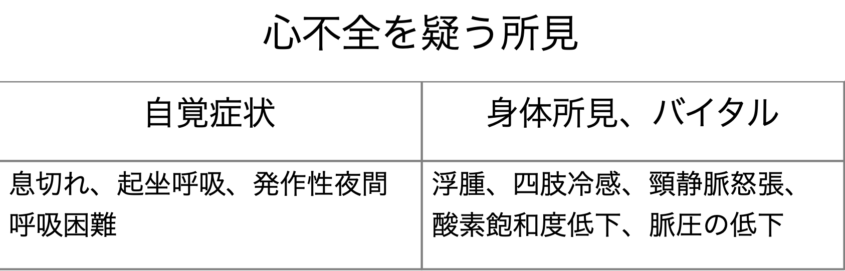 - 項目をチェックしていくつか該当したらとりあえず心不全を疑ってみるのがよいと思う