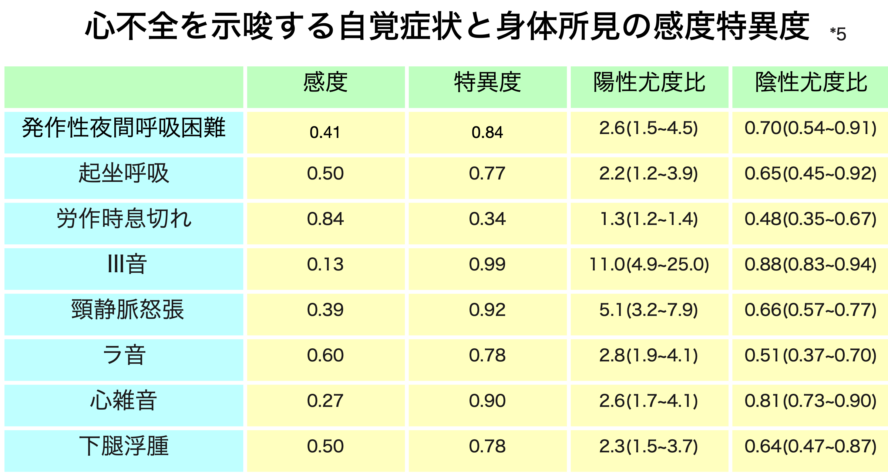 - 各所見の心不全診断における感度・特異度は示されていない
