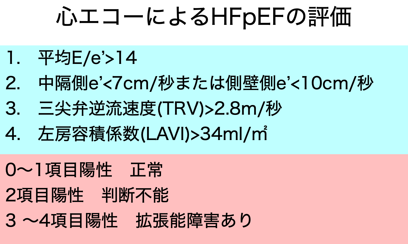 HFpEFにおける心不全の評価には、E/E’、E’、三尖弁逆流速度(TRV)、左房容積係数(LAVI)を用いる