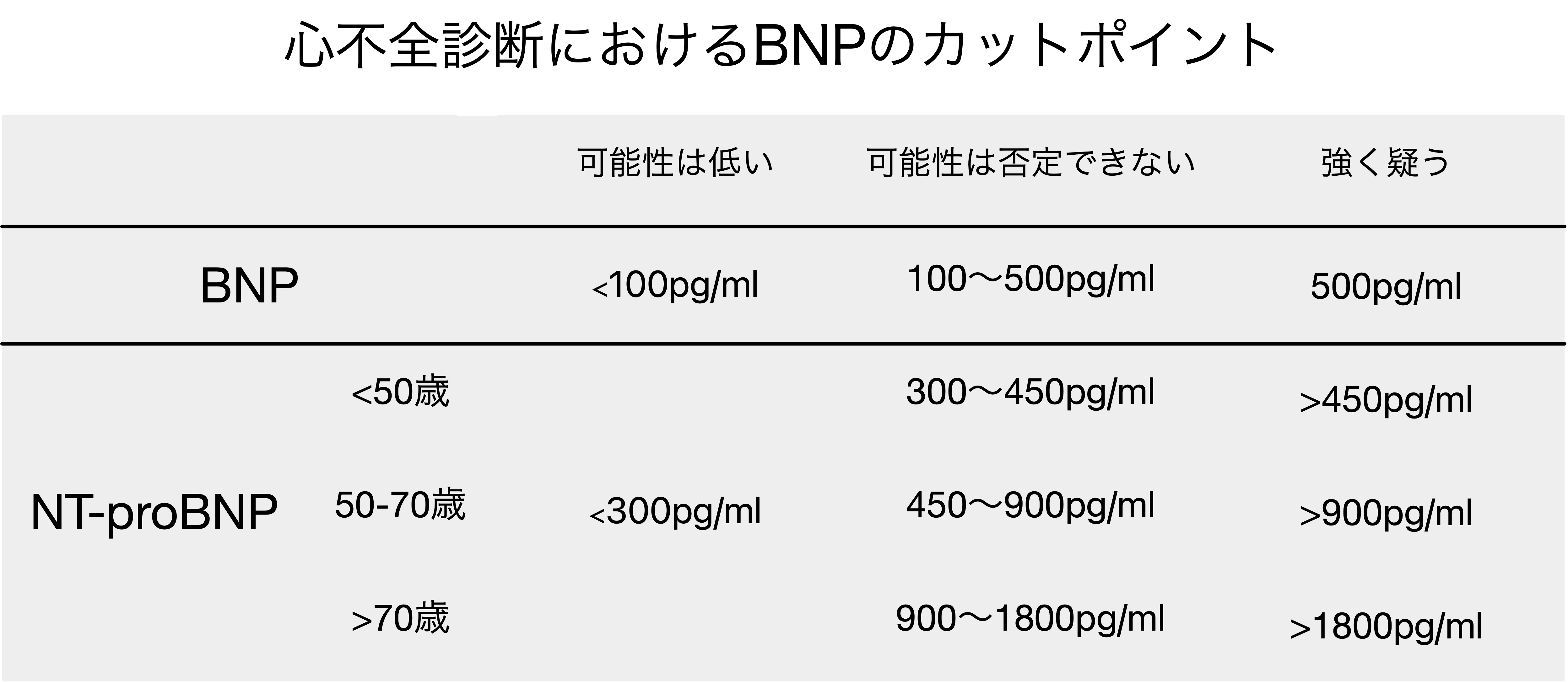 - BNP≧100pg/mlをカットオフ値とすると、感度0.95、特異度0.63、陽性尤度比2.57、陰性尤度比 0.08、陽性的中率67%、陰性的中率94%(*3)