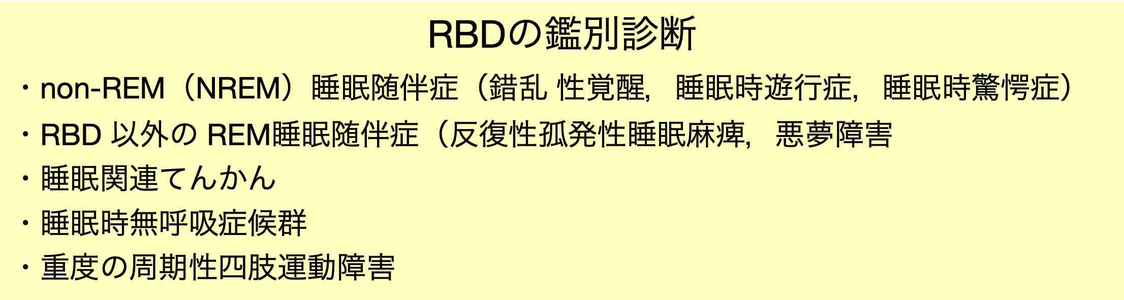 ・REM睡眠中に夢を見ても、錐体路が遮断されているため夢内容が行動になって現れることはないが、RBDではこの遮断が破綻してるため行動化する