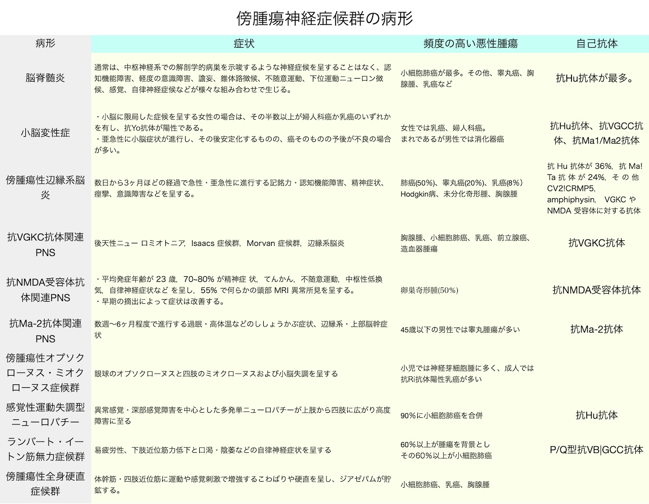 - 悪性腫瘍患者全体の0.01〜1%程度に生じる比較的稀な病態 ・約80%の例で神経症状の発症と抗体の検出が、腫瘍発見に数カ月から数年先行する