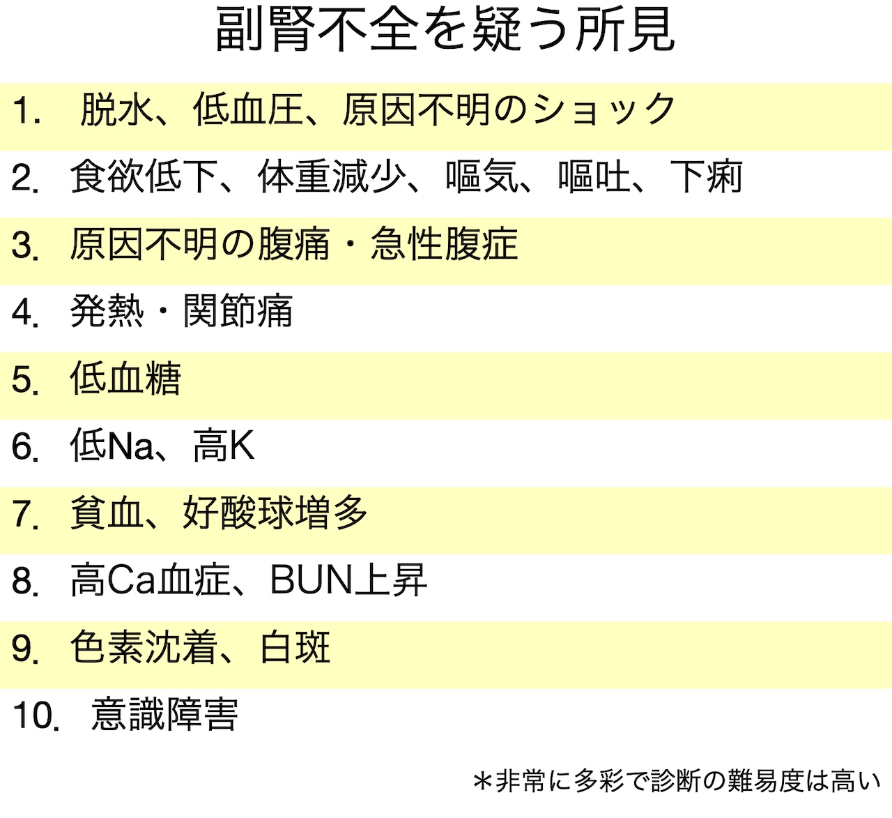 【原因と誘因】 既知・未知の慢性副腎不全症患者に種々のストレス(感染、外傷など)が加わり、ステロイド需要が増加した場合(長期間のステロイド内服を背景に生じやすい) 治療目的で 長期服用中のステロイド薬の減量・中止が不適切に行われた場合の発症が多い 誘因)感染、特に胃腸炎