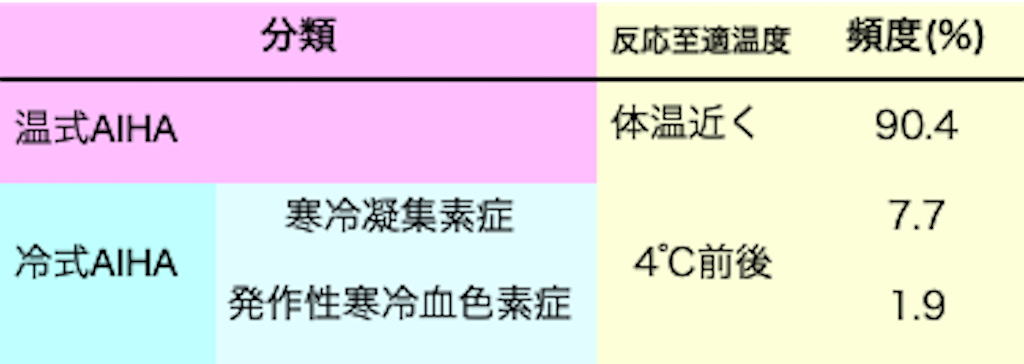 - 自己抗体が赤血球と反応する至適温度によって温式と冷式に分類される。礼式はさらに寒冷凝集素症と発作性夜間血色素尿症に分類される(下表)
