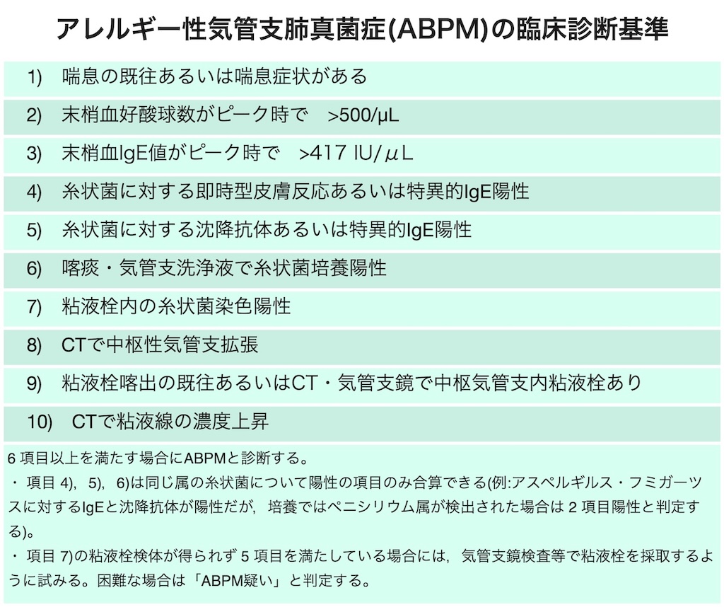 - 原則として成人喘息患者あるいは嚢胞性線維症患者にみられる。本邦では嚢胞性線維症は稀である