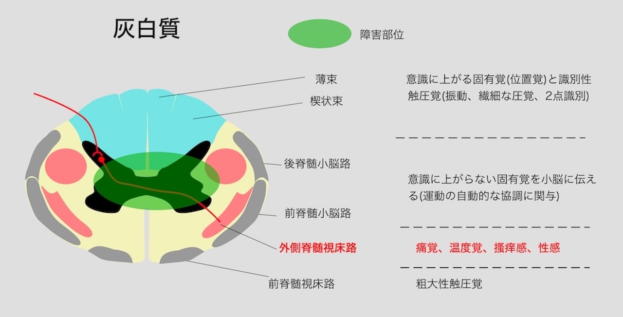 - 灰白質が障害されるので、ここで交叉する外側脊髄視床路が侵される