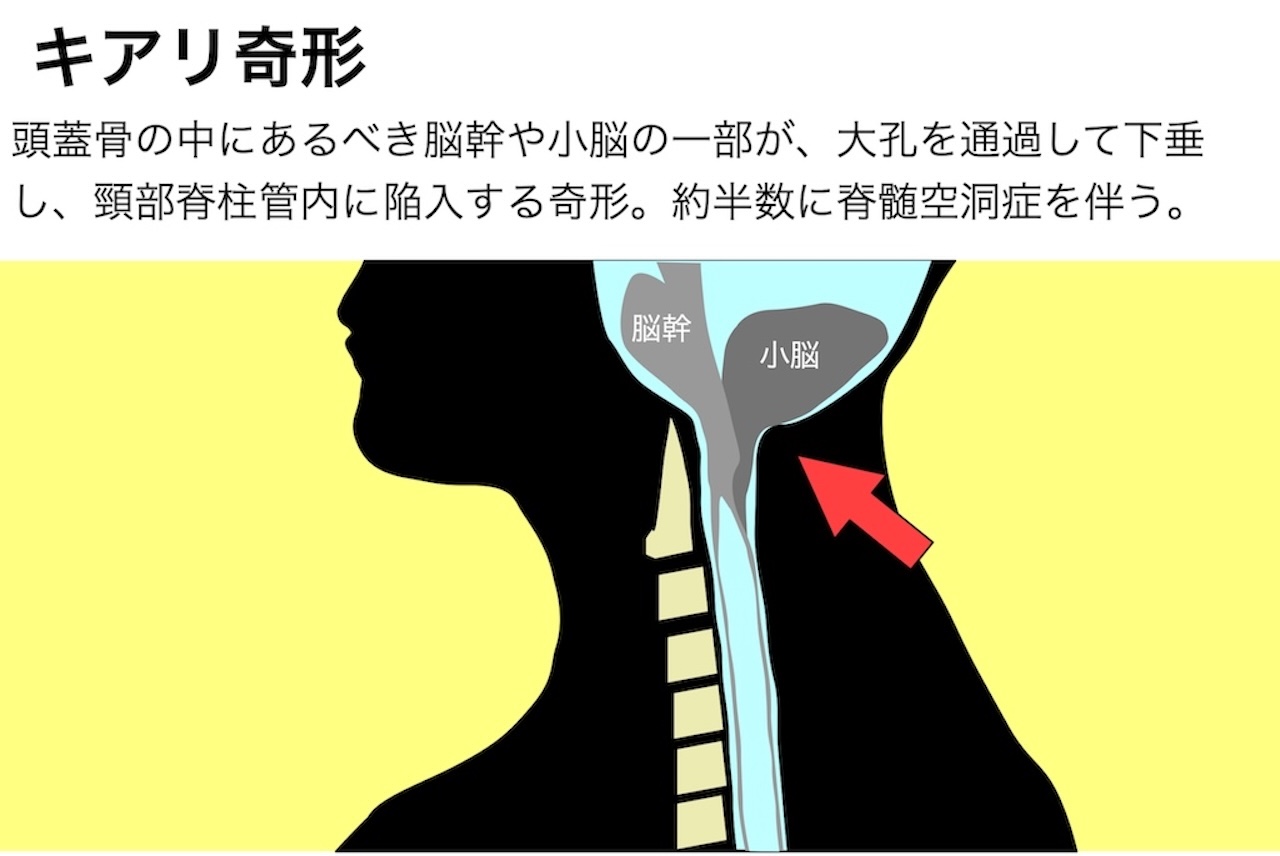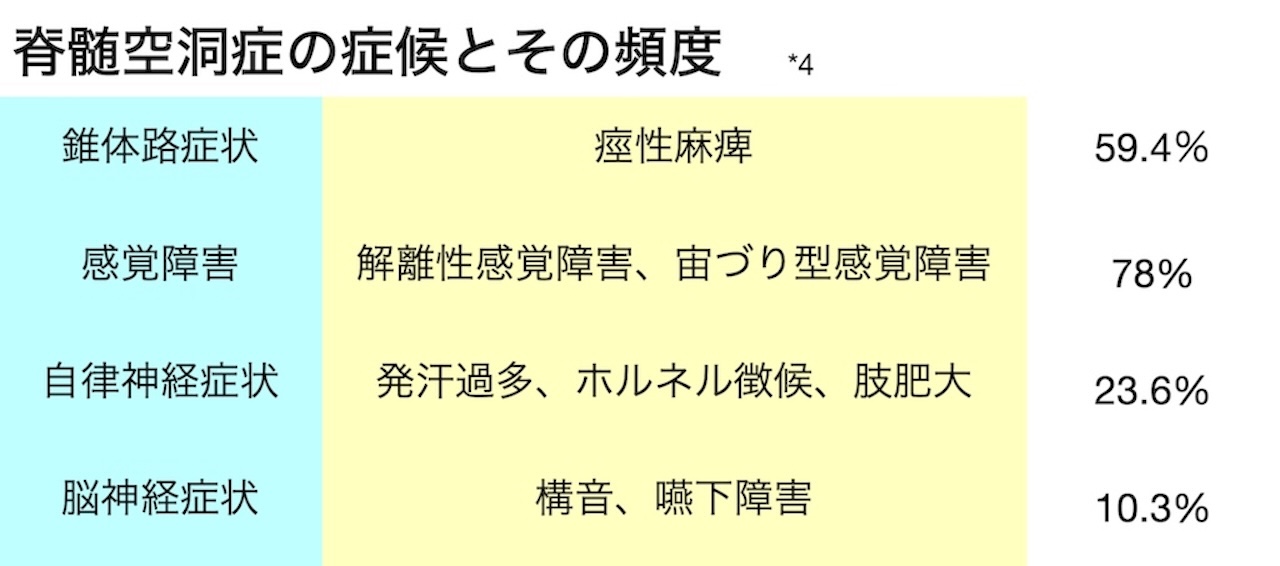 - 背景となる病態としては52%がキアリ奇形であり、その他、脊髄損傷、脊髄感染症、腫瘍などと関連して生じる