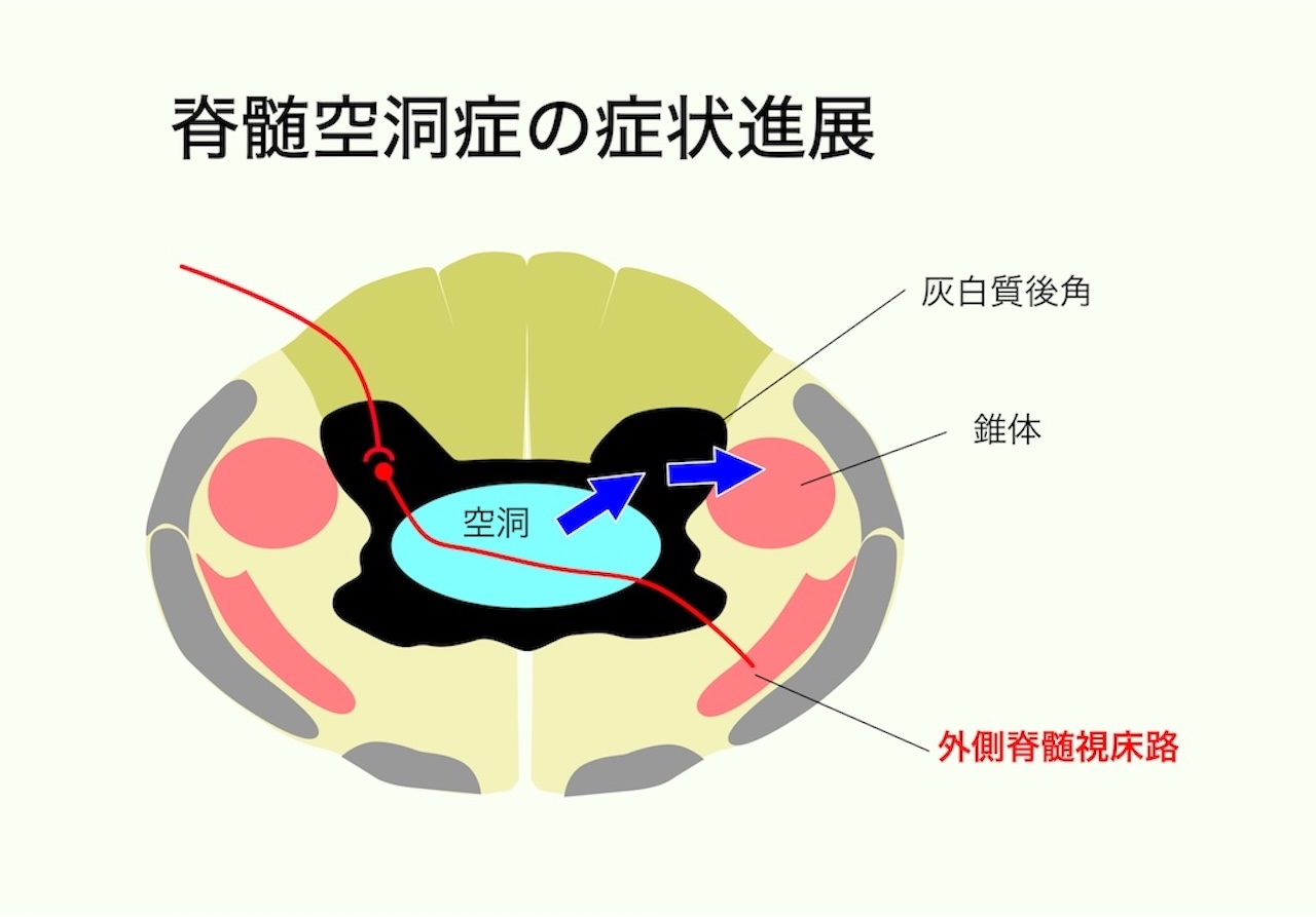 - 脊髄内に脳脊髄液が貯留した空洞が多髄節にわたって形成され、腔内の圧力などの原因によって空洞の周囲の組織に変性が生じる