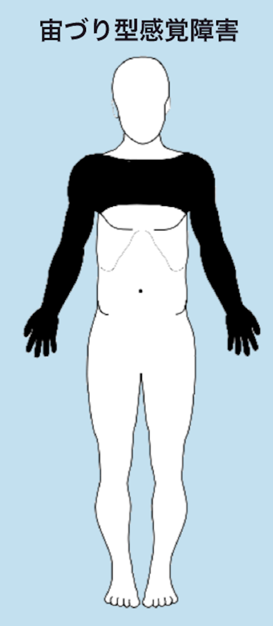 宙づり型温痛覚障害 上下に連続して範囲の限られた髄節が障害されるので、両側対称性で上下に限られた範囲の感覚障害をきたす