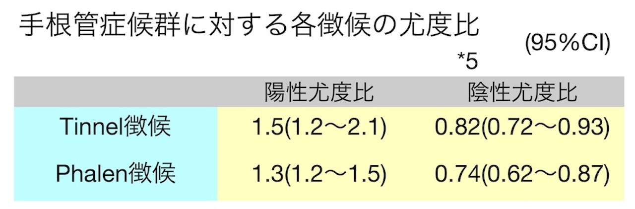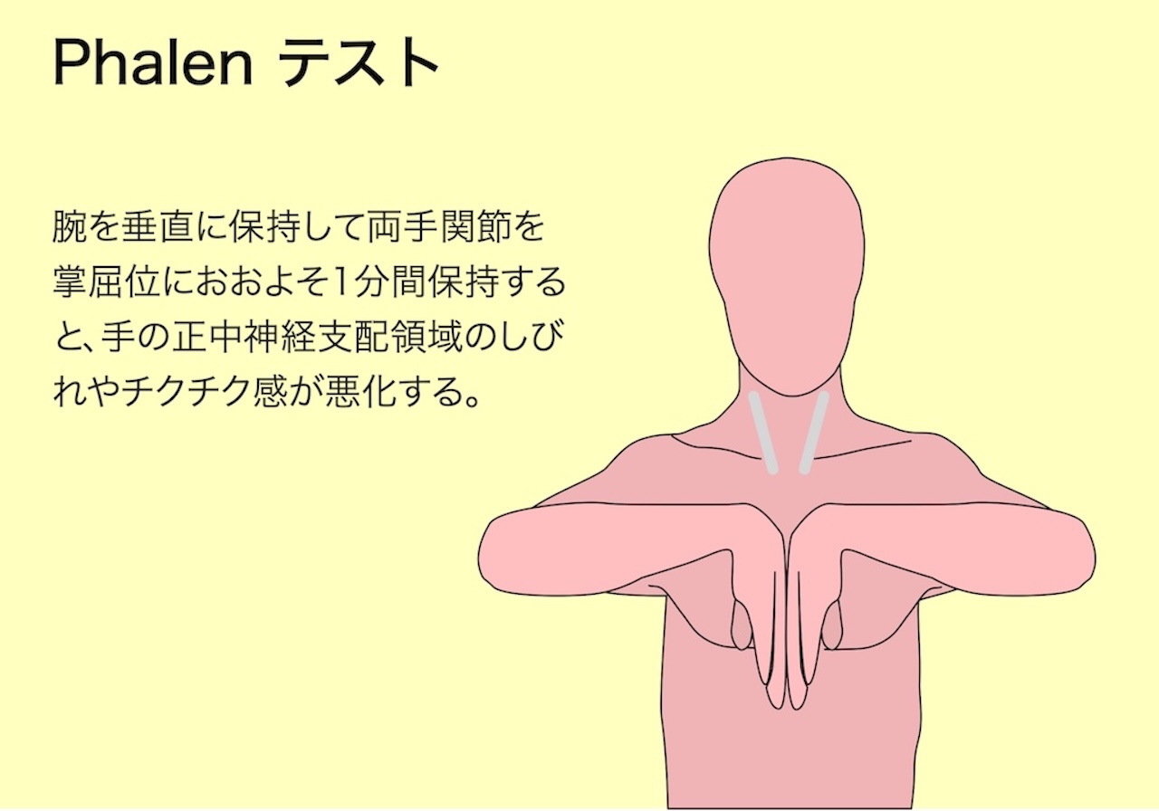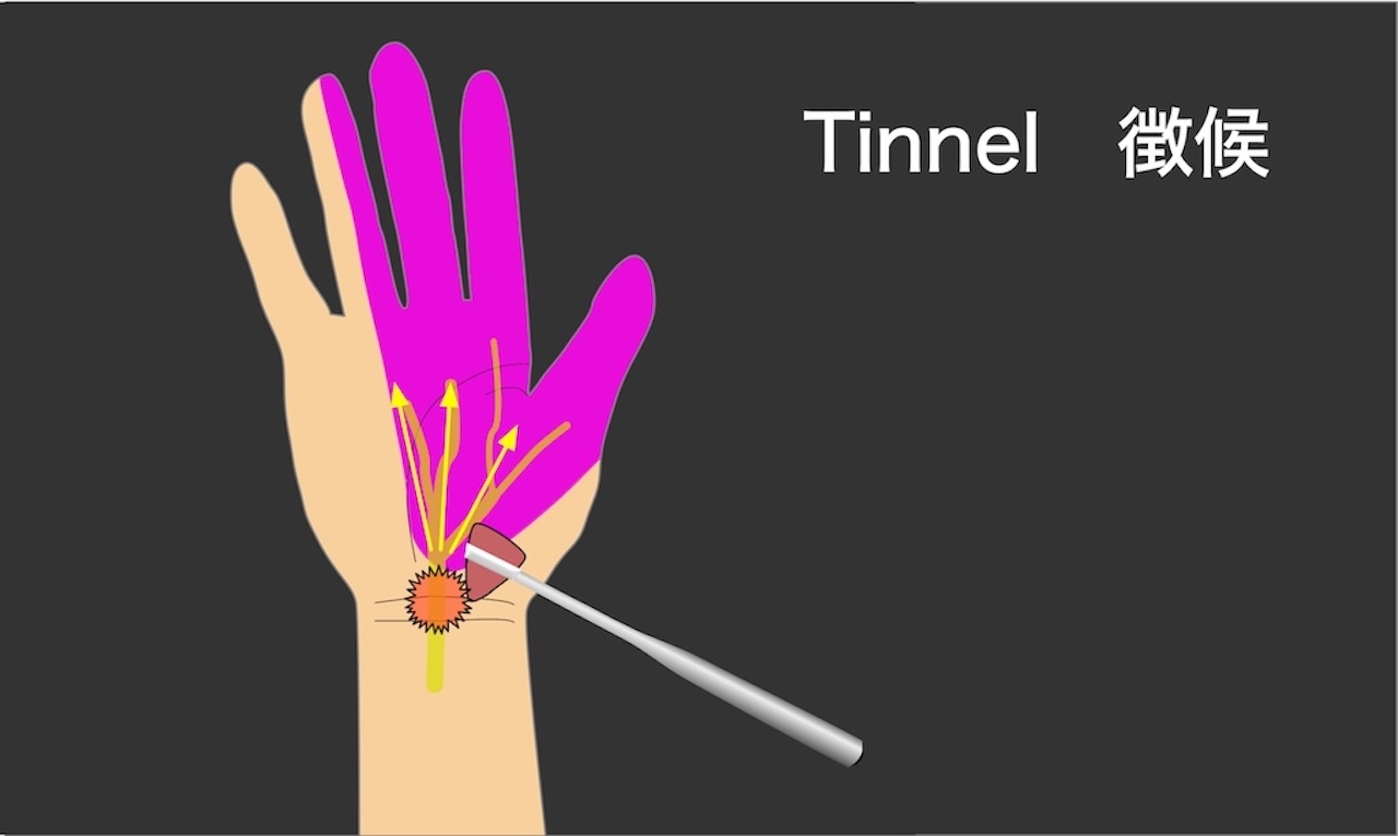 - 手根管症候群の場合は手関節付近の正中神経を叩くととチクチクとしたしびれ感が放散すれば陽性