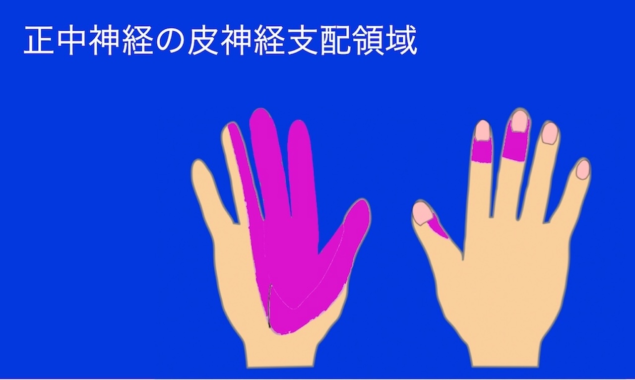 - より近位で分岐する正中神経手掌枝の支配領域である母指球には症状がみられない