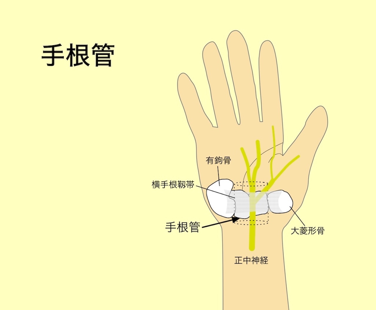 - 底面側面を手根骨、上面を横手根靱帯に囲まれたトンネル上の構造