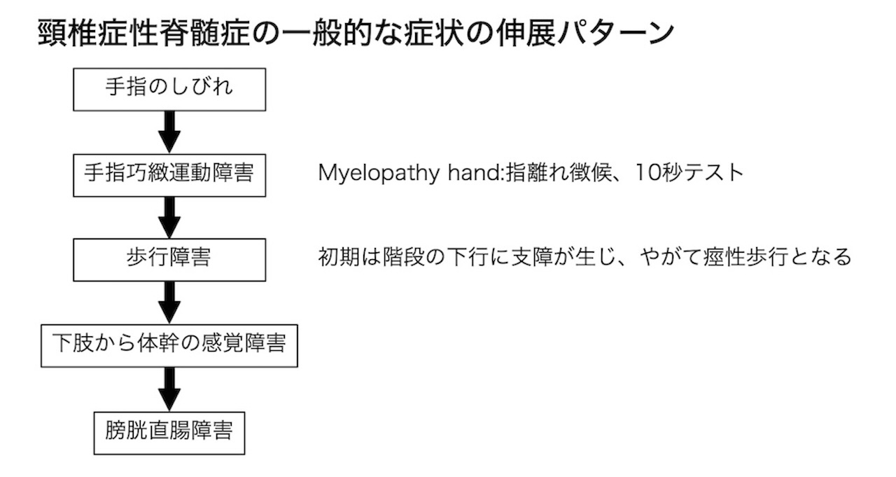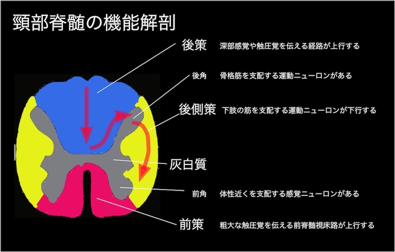 - 脊髄障害は脊髄中心部(上肢症状)からはじまり、徐々に後側索(下肢の痙性麻痺)、最後に前側索(下肢の、温痛覚障害)に広がる