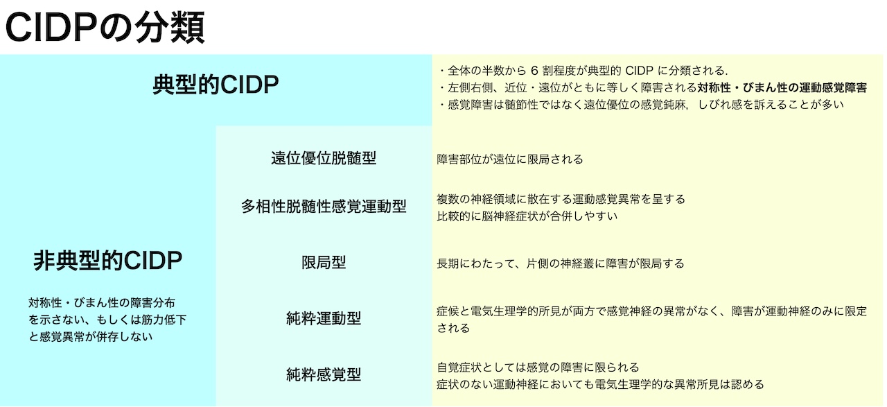- 2ヶ月以上にわたる進行性または再発性の経過で、運動感覚障害を特徴とする免疫介在性の末梢神経疾患