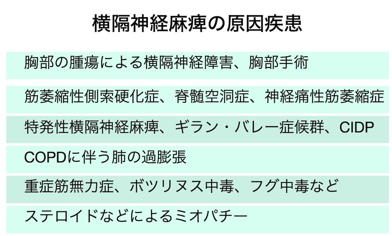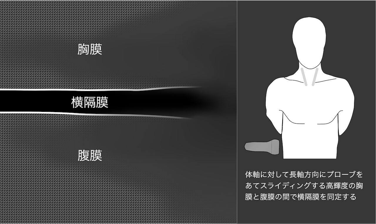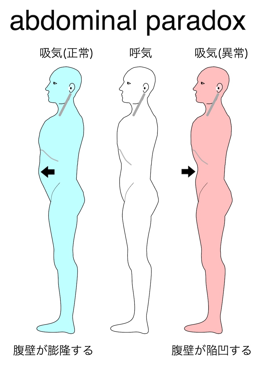 【評価】 胸部XP「吸気不十分」「肺の過膨張」 理学所見 abdominal paradox 立位のほうが観察しやすいが、臥位でも生じ得る 横隔膜エコー 正常な場合は吸気時に横隔膜が厚くなるが麻痺があると厚くならない 正常な吸気時と呼気時の横隔膜厚の比は>1.2(*1) 血液ガス PCO2の増大