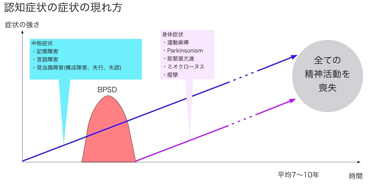 - 記憶障害からはじまり、それに続いて徐々に言語障害、各種の見当識障害(構成障害、失行、失認)などが出現する。これらは全例で起こるので中核症状と呼ばれる