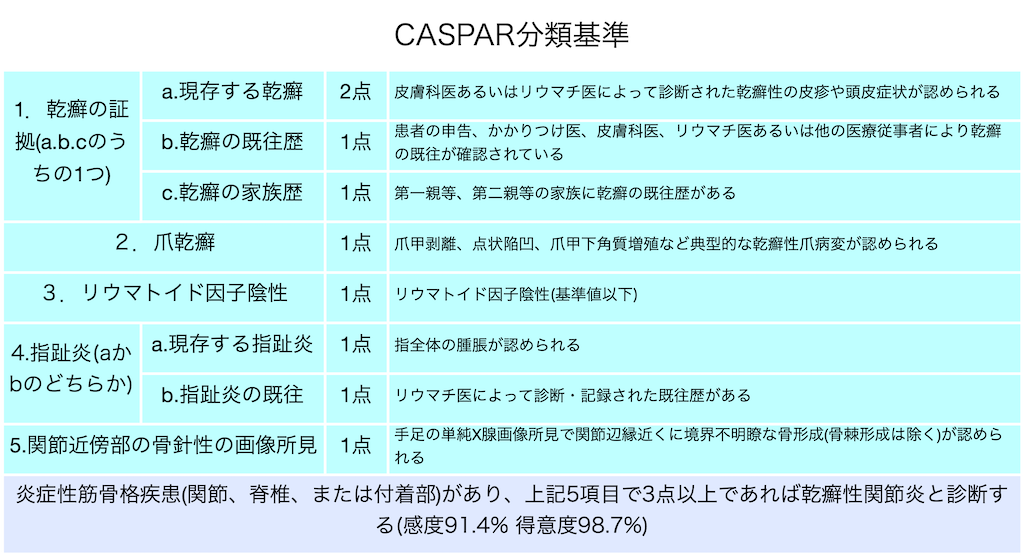 - 約7-8割が皮膚病変先行型であり比較的容易に診断できる。しかし、関節炎が先行する例が約1割、関節炎と皮膚病変が同時に発症する型もあって、これらの場合は関節リウマチや変形関節症、他のタイプの脊椎関節炎との鑑別は容易ではない
