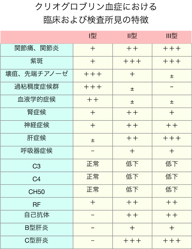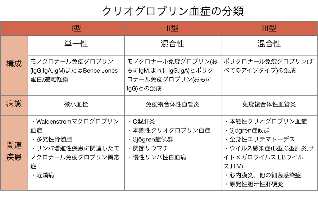 - クリオグロブリンの構成、病態、関連疾患から次の3タイプに分類される