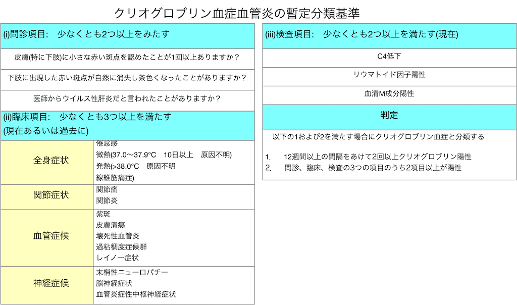 - 免疫複合体性血管炎を示す患者をクリオグロブリン血症性血管炎とよぶ