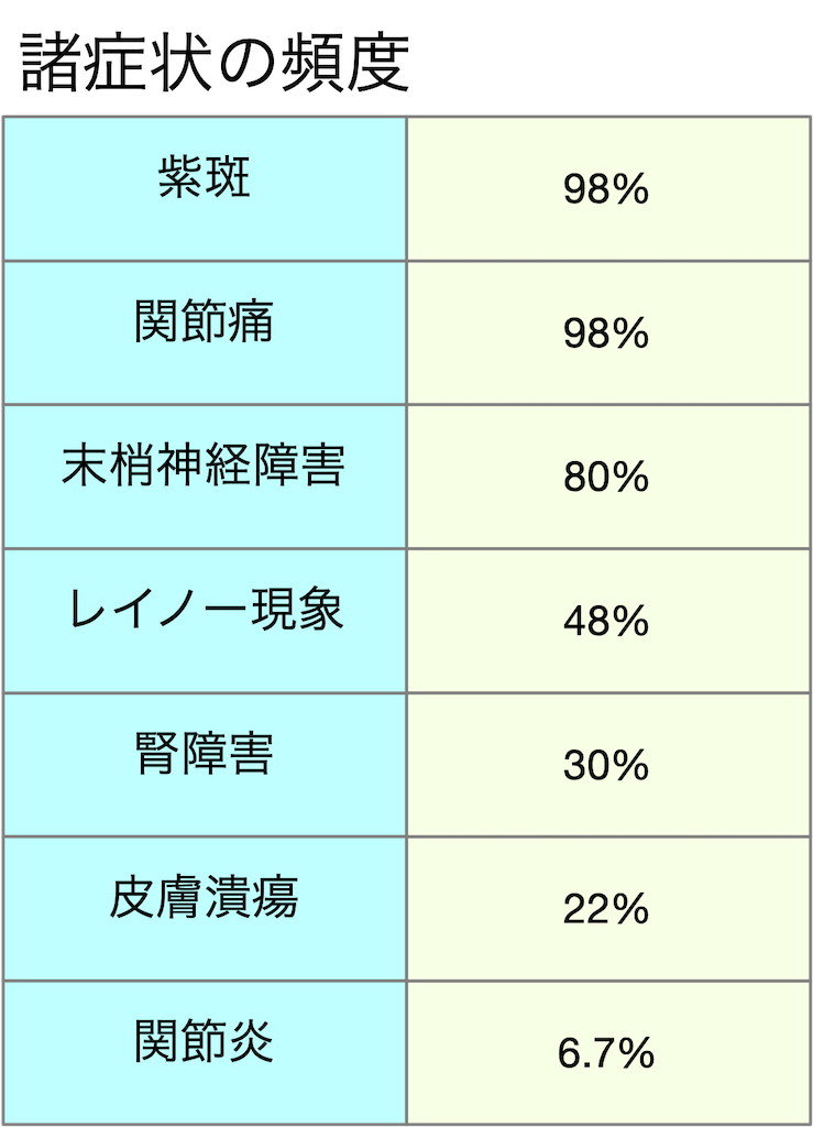 - 血管内で免疫複合体の沈降物が形成されることにより小血管に血管炎が生じる