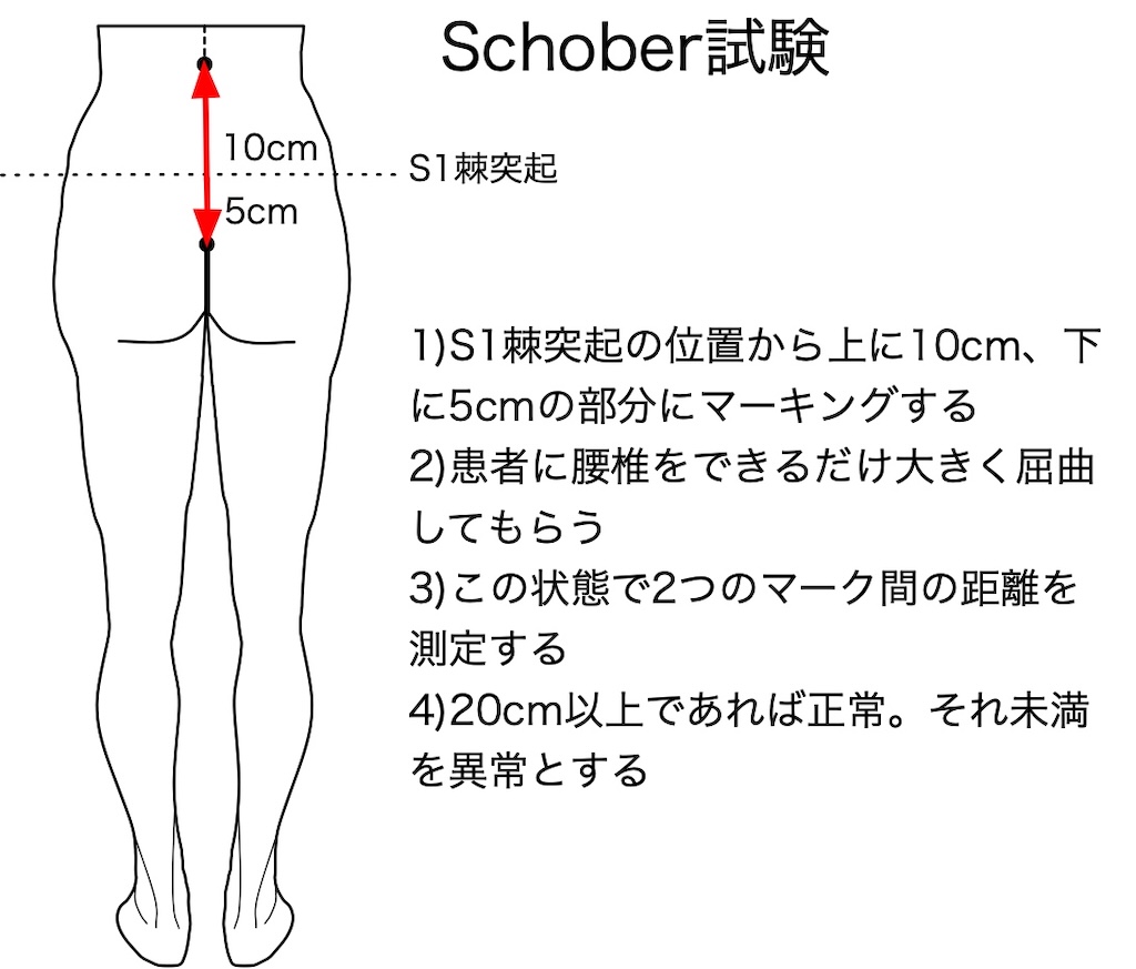 - 腰椎可動域制限(Schober試験で5cm以下)