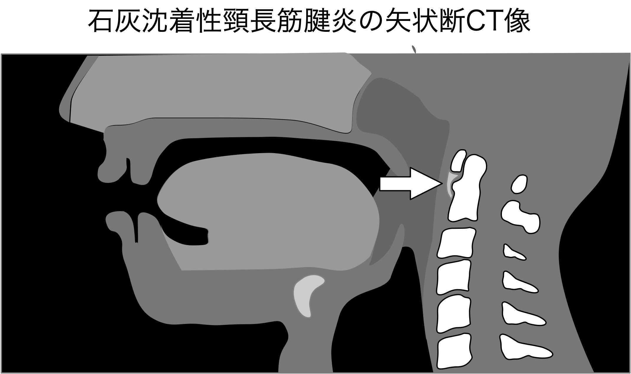頸長筋腱の結晶誘発性炎症 好発年齢は20〜60歳 急性の頸部痛、頸部運動制限、咽頭痛、嚥下痛、発熱 CRP高値、白血球増多 CTで第1〜2頸椎前面の頸長筋付着部に石灰化像を認める 治療はNSAIDSやステロイドを用いる