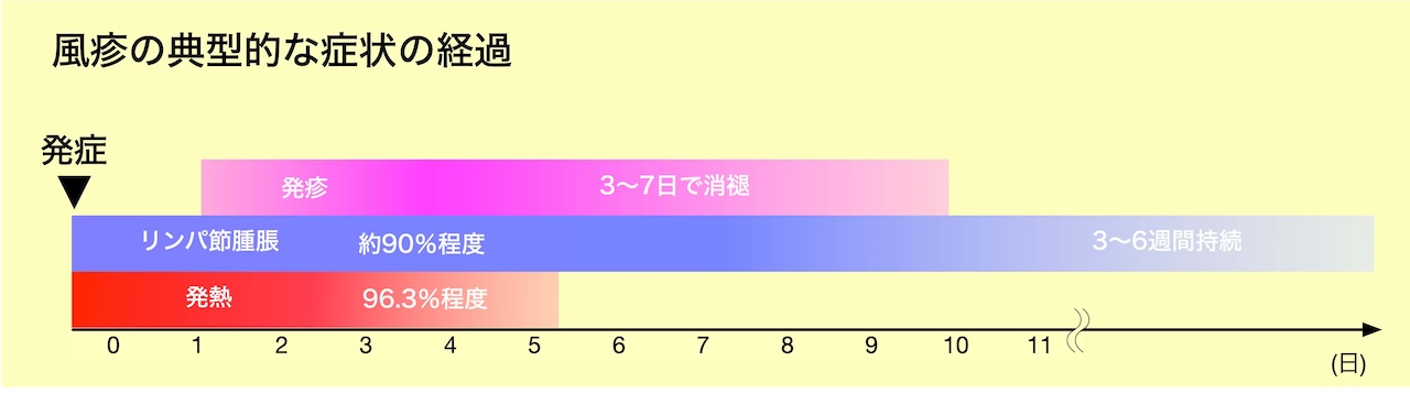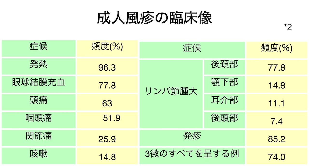 - 3徴候は発熱、発疹、頸部リンパ節腫脹