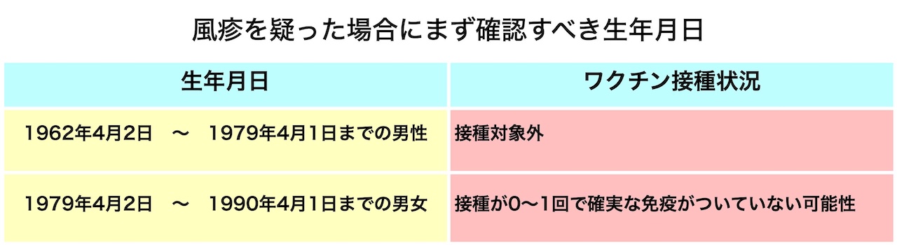 風疹では、年齢や性別によってしっかりとしたワクチン接種が行われていないグループがあり、疑ったらまず生年月日を確認する