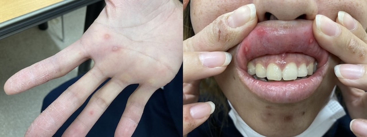 - 口腔では直径2〜3mmの浅いアフタとして出現