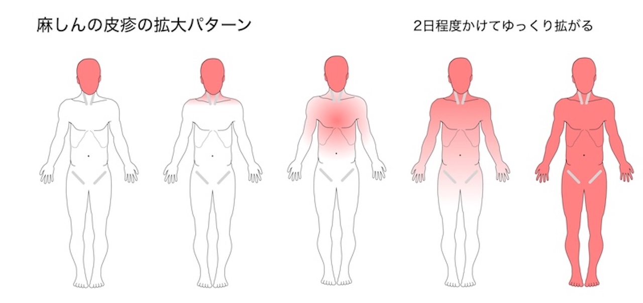 - 皮疹は頭部からはじまり、2日程度かけて下行性に全身に拡大する