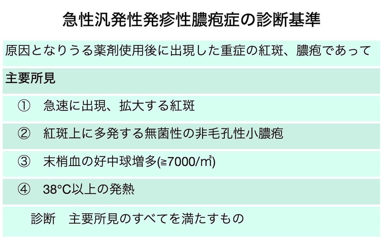 - 38℃以上の高熱とともに、全身にびまん性の紅斑や紅皮症をきたし、無数の小膿疱を伴う薬疹