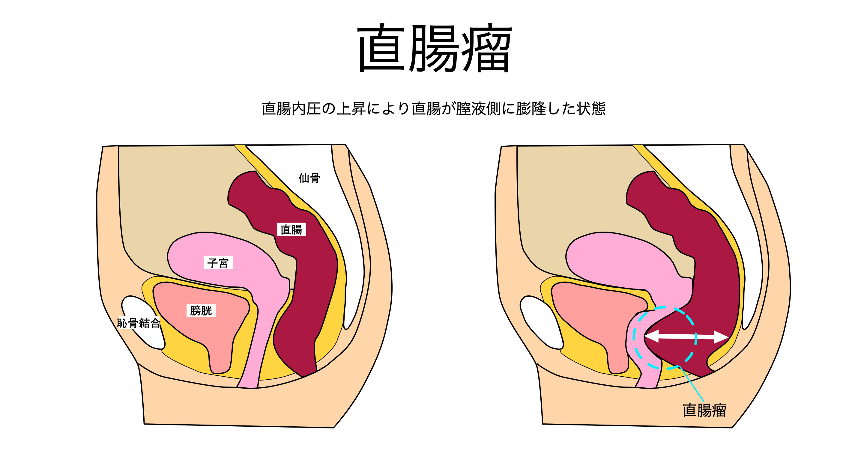 - 直腸膣中隔が脆弱になり排便時に膣壁側に直腸が膨隆してしまう状態